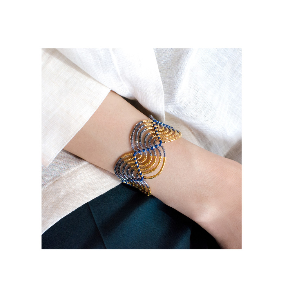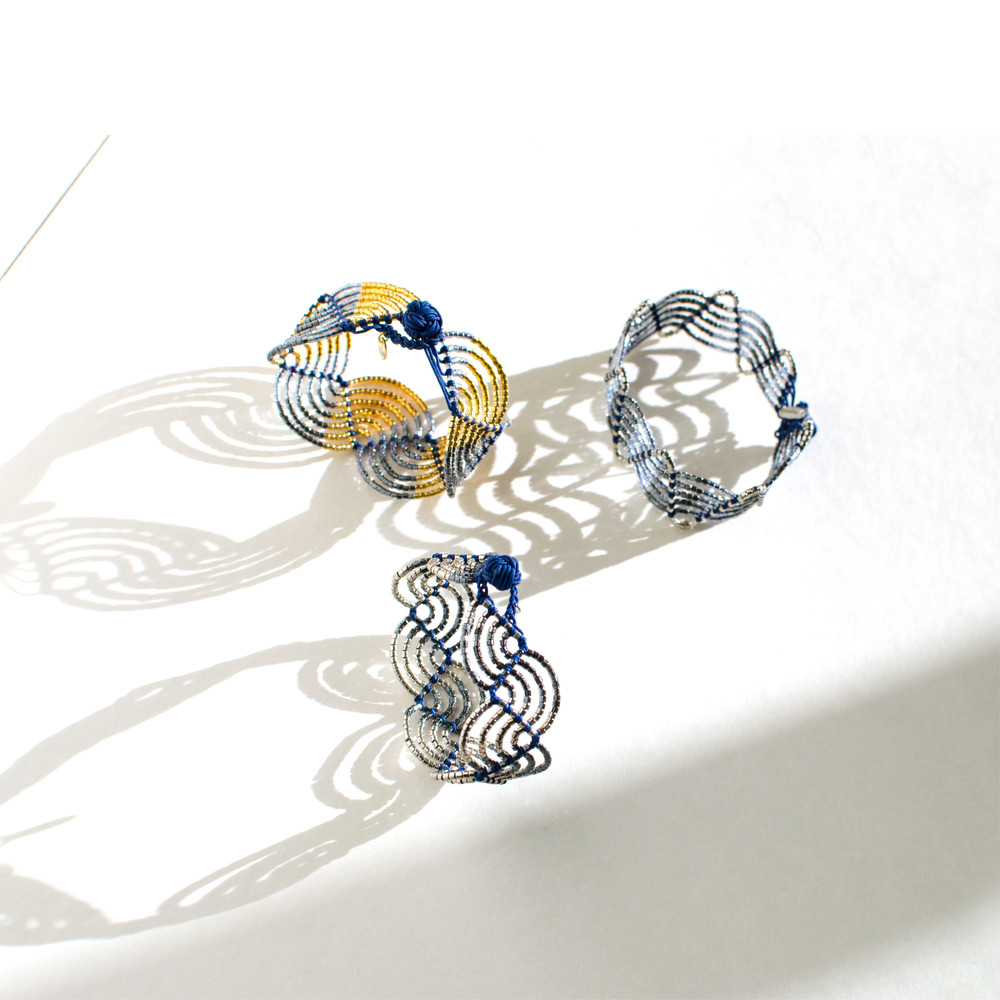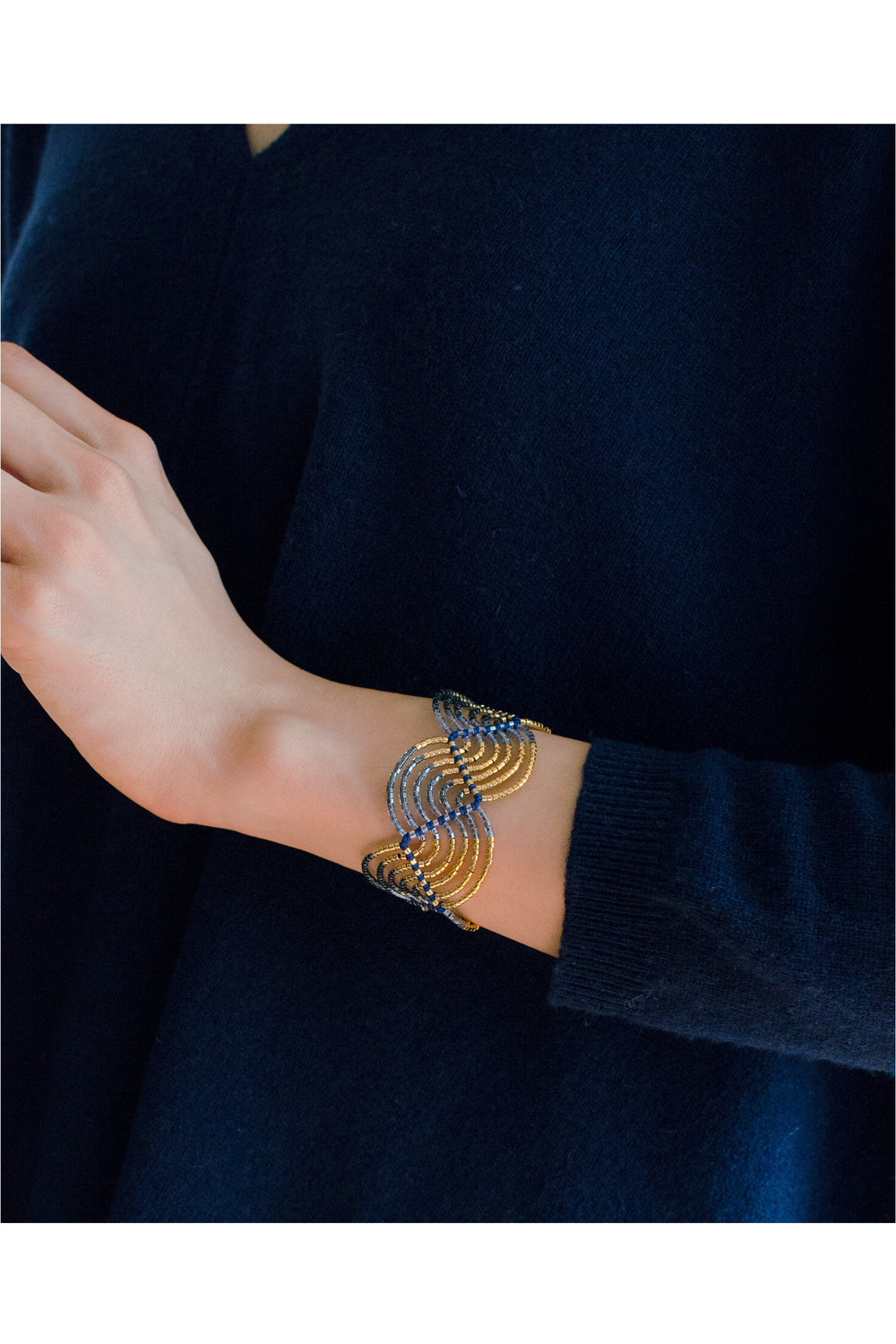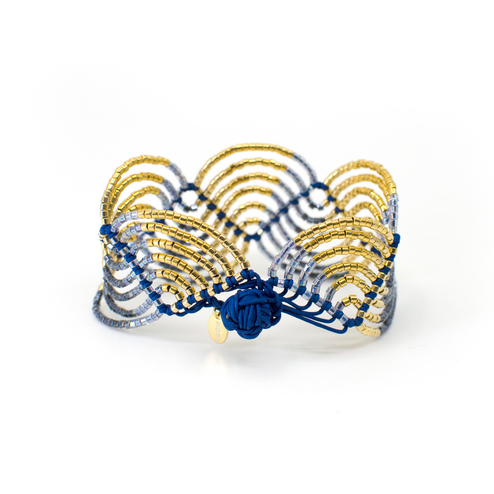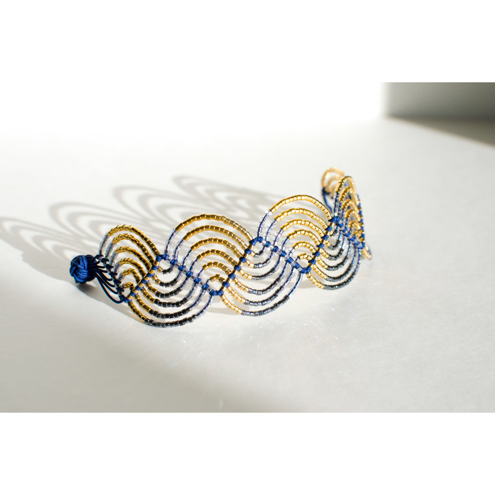 푸른빛과 골드빛의 4가지 컬러의 구슬이 사선 형태로 그라데이션 되어있는 디자인입니다.