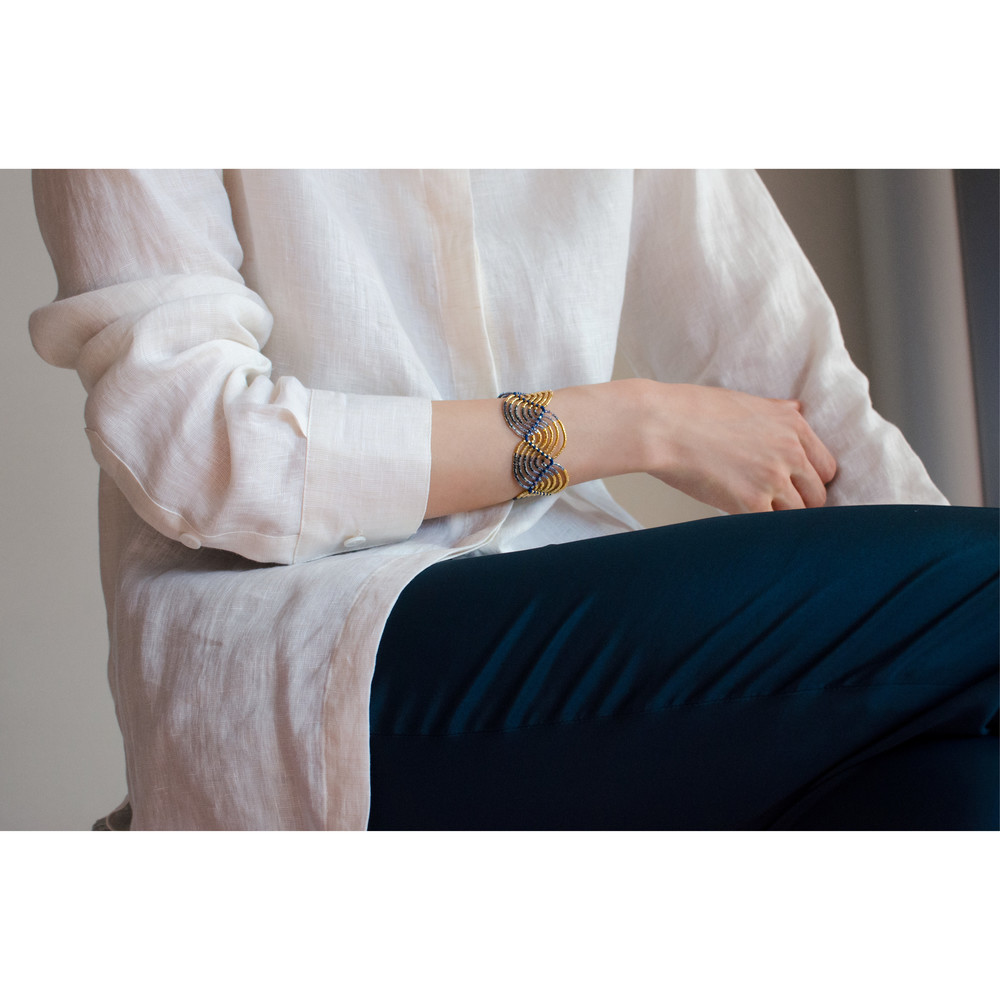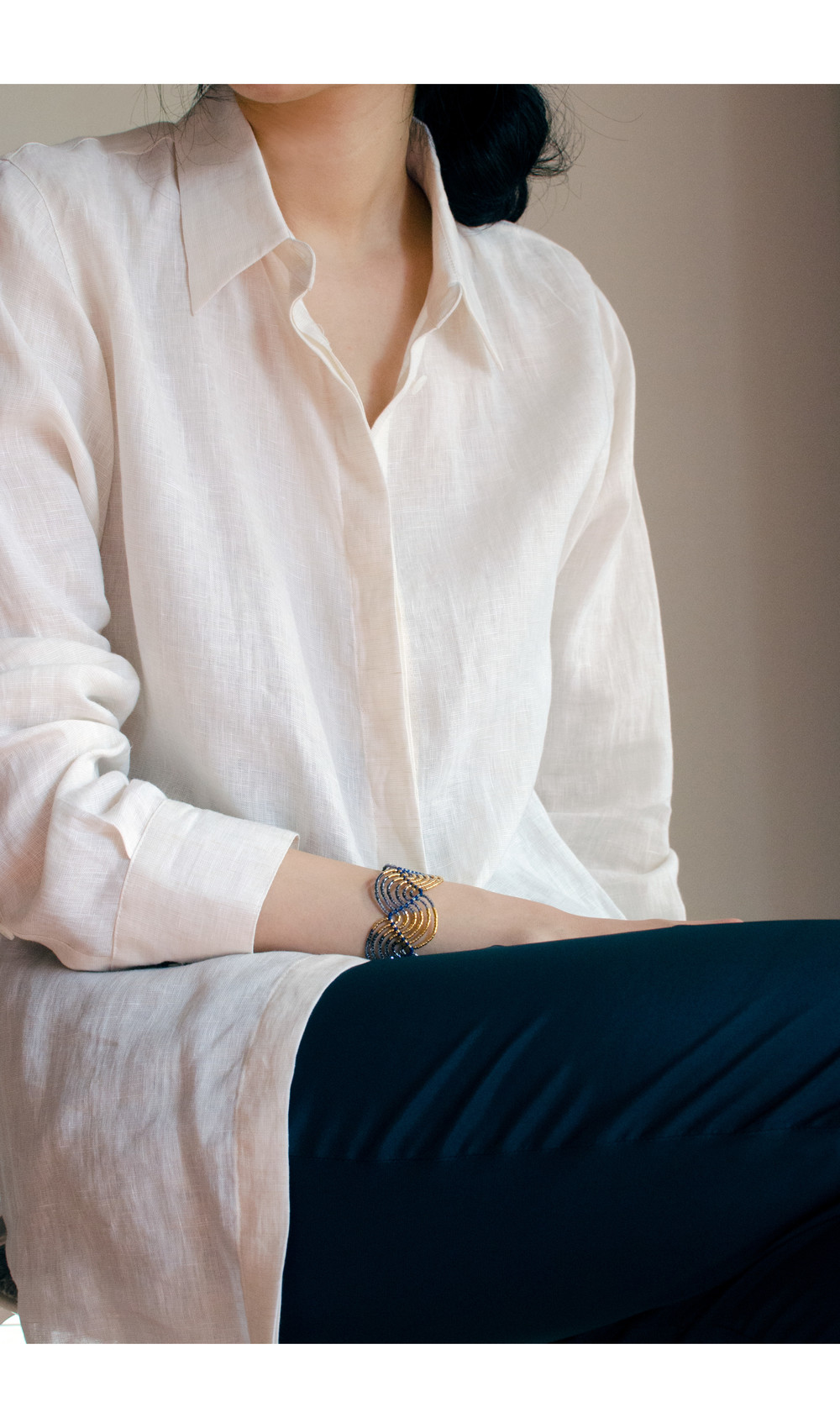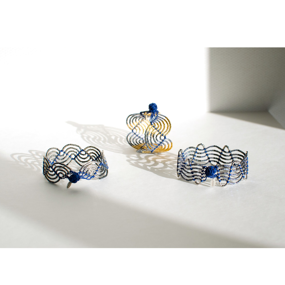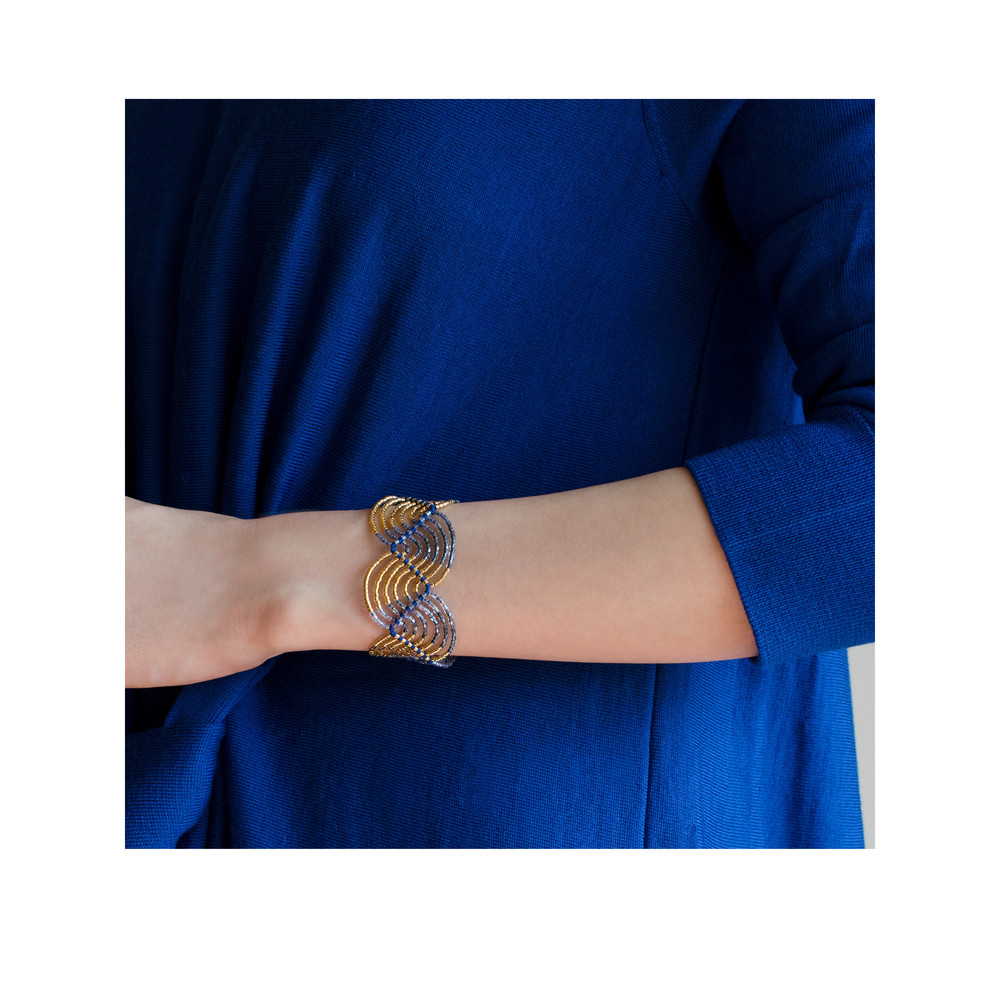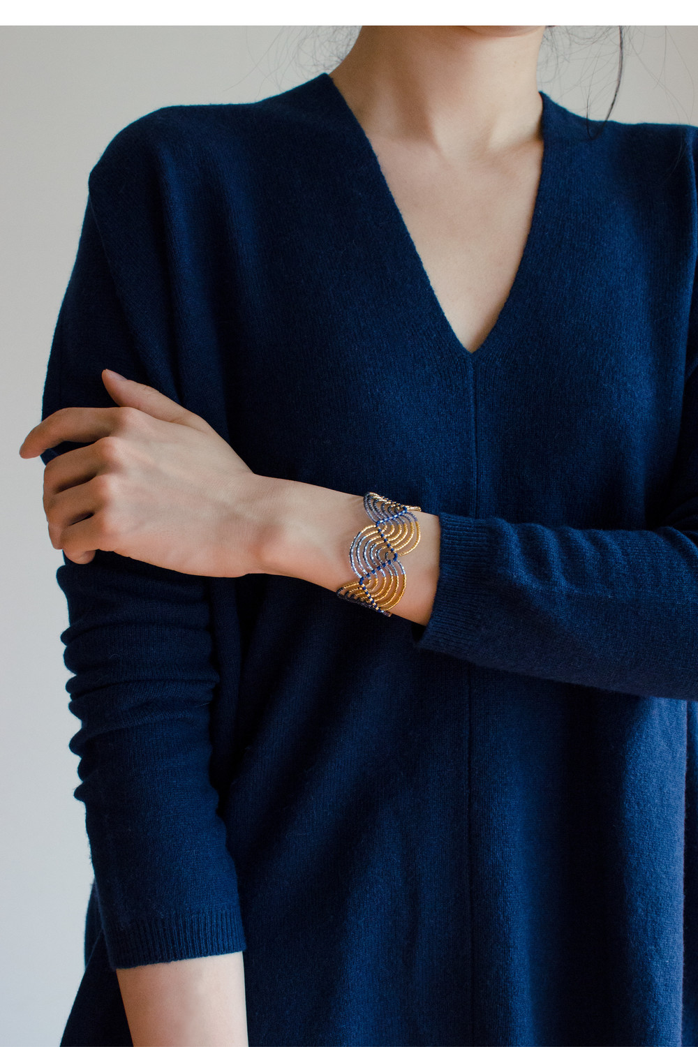 푸른빛과 골드빛의 4가지 컬러의 구슬이 사선 형태로 그라데이션 되어있는 디자인입니다.